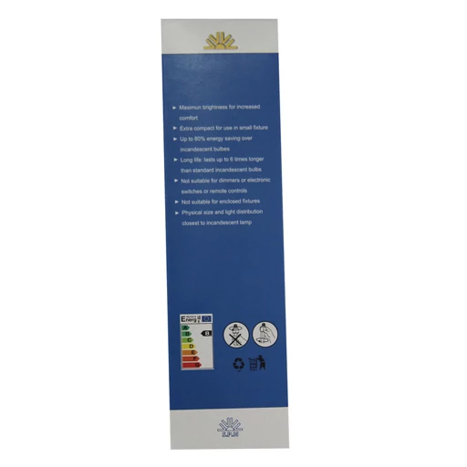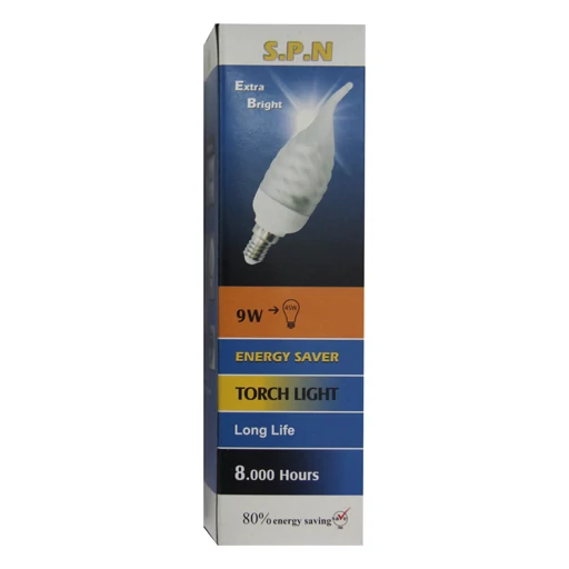 لامپ کم مصرف با 9 وات و نور پایین و سرپیچ شمعی بیشتر در لوسترها و فضاهایی که به نور ملایم احتیاج هست کاربرد دارد.نور این لامپ در ابتدا بسیار پایین بوده و حدود 2 دقیقه طول میکشد تا به نور واقعی که نور ملایمی است برسد.